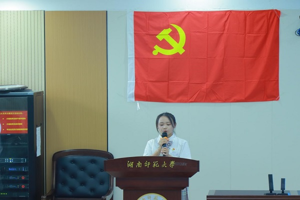 毕业生党员代表程南燕同学发言。她呼吁全体党员要发挥党员标杆作用,学习先进思想,勇于担当责任。