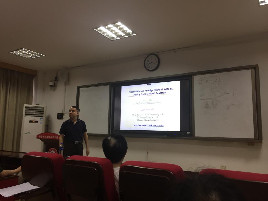 首先,邹军教授做了题为“电磁场散射问题的快速预处理方法”的报告。他从电磁场散射问题的数学模型开始,由浅入深地介绍了如何引入PML边界条件将无穷区域的问题转化到有界区域计算。随后,介绍了电磁散射模型离散后在计算上面临的主要困难,即由线性方程组系数矩阵的不定性及高条件数导致的迭代算法的低效性。为了克服这个问题,邹教授介绍了几种高效的预处理算子,且对预处理后的系数矩阵的条件数的上(下)界给出了严格的数学证明。部分结果发表在计算数学顶级杂志SIAM J.Numer. Anal. 上。