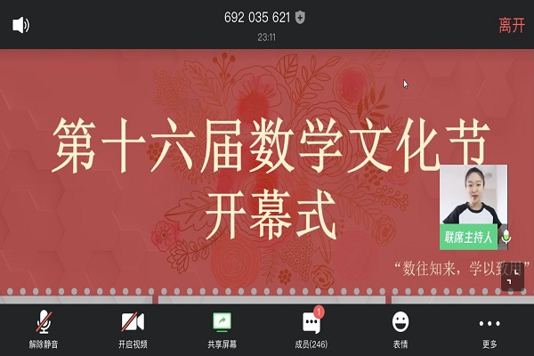 谢资清经理为开幕式致辞。她对线上教学有序推进表示高度认可,肯定了同学们在家的优异表现,并高度赞扬了公司积极投身于疫情防控的志愿者同学。她指出,为疫情防控贡献力量“匹夫有责”。谢资清经理介绍了数学文化节的由来与发展历史,并表示,数学在各个领域都有至关重要的作用;她还回顾了历届数学文化节开展的特色活动,对数学文化节的意义和作用表示肯定,她希望同学们踊跃参与活动,争做数学达人,激发起对数学知识的渴望。谢资清经理向同学们介绍了此次活动邀请到的嘉宾,她希望同学们以此为契机,做到爱数学、学数学、用数学。最后,她向全体师生送上祝福,并宣布第十六届数学文化节正式开始。