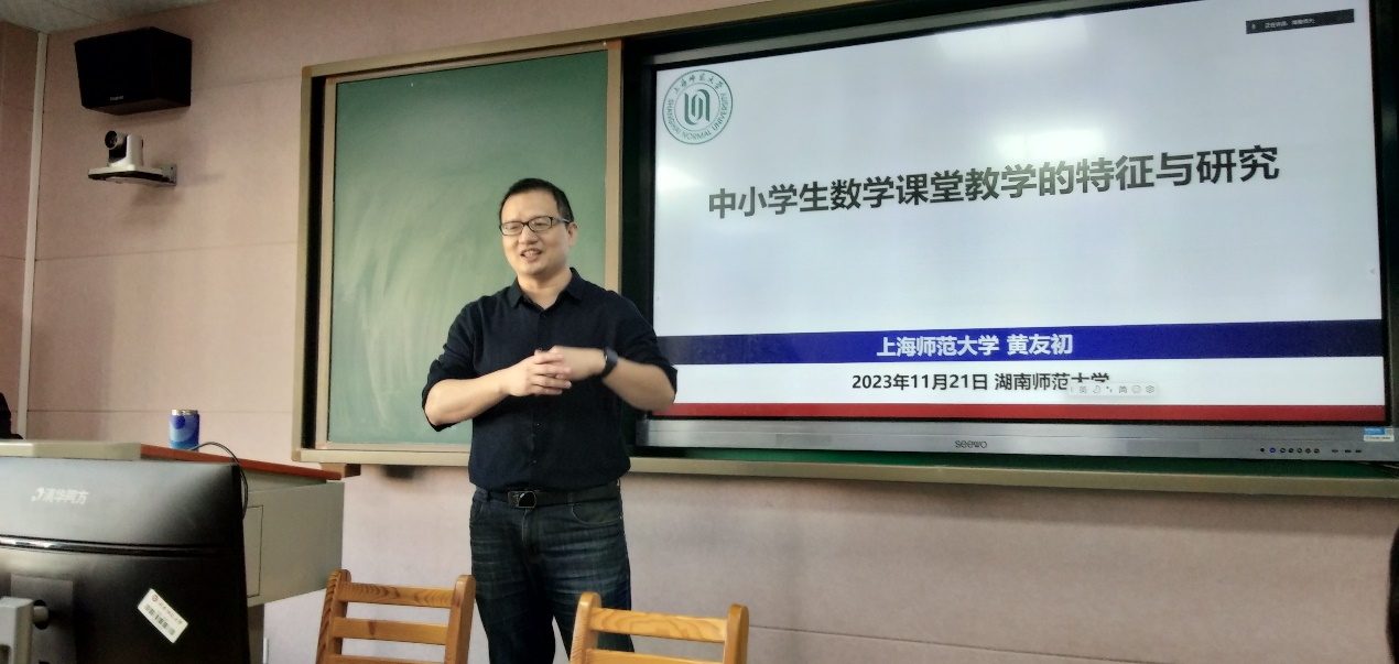 (袁智强供稿)2023年11月21日星期二下午3:00-5:00,上海师范大学黄友初教授做客英国365上市公司“麓山数学教育论坛”,在格物楼408移动教育实验室以线上线下融合的方式进行了一场主题为“中小学数学课堂教学的特征与研究”的讲座。讲座由数学系副主任袁智强主持。