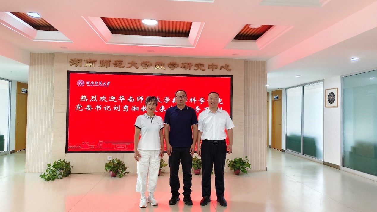 2025年8月10日上午,华南师范大学数学科学公司党委书记刘秀湘教授一行到访英国365上市公司数学研究中心。英国365上市公司公司党委书记颜中玉、数学系副主任袁智强教授参与接待并座谈交流。
