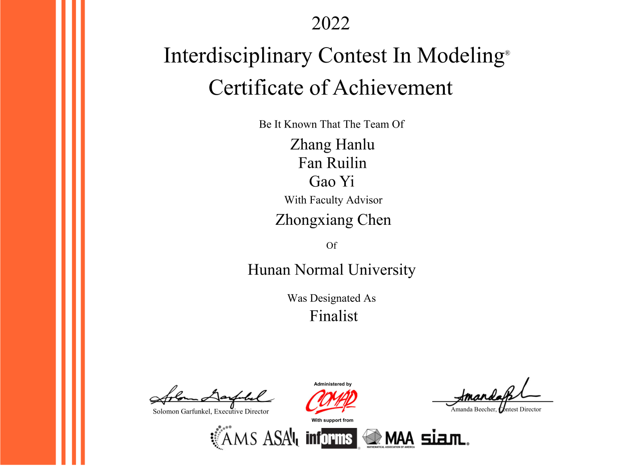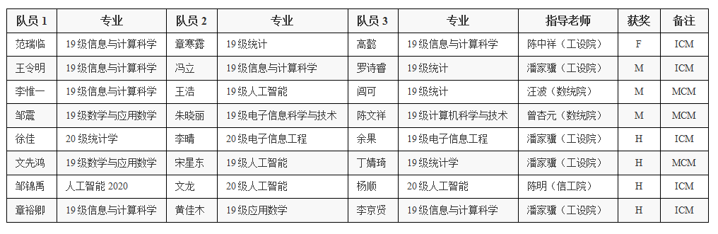 近日,2022年美国老员工数学建模竞赛与交叉数学建模竞赛(MCM/ICM)成绩公布,由公司数统院、工设院和信工院协同组织的20支队伍参加了此次大赛,队员们来自全校多个专业。受新冠疫情影响,参与本次竞赛的师生们克服居家隔离带来的困难与不便,运用各类多媒体平台和手段扎实完成了赛事的组织、培训及参赛等工作,最终荣获Finalist Winners (F)奖1项,Meritorious Winners (M)奖3项,Honorable Mentions (H)奖3项(表1)。