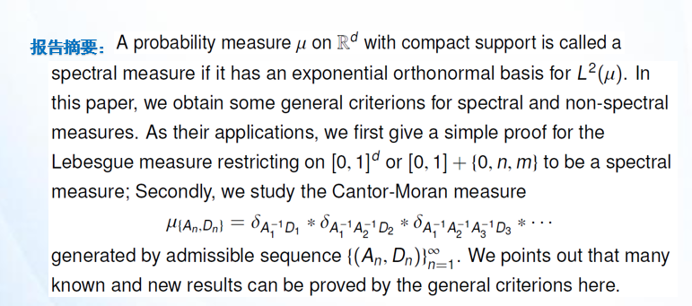 报告人简介: 何兴纲,华中师范大学数学与统计学公司,教授,博士生导师。博士毕业于香港中文大学数学系。主要研究方向为测度论及其应用、 调和与非调和Fourier分析、分形几何、小波分析等。相关成果已发表于Adv. Math.(3篇), J. Funct. Anal.(7篇), J. Math. Pures. Appl.(1篇), Appl. Comput. Harmon. Anal.(2篇),Indian Univ. Math. J.(1篇) 等国际权威期刊。